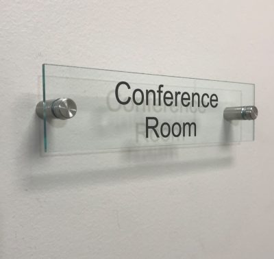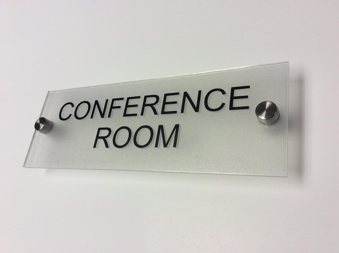 Glass Name Plate with vinyl Letters mounting with Stainless steel struds