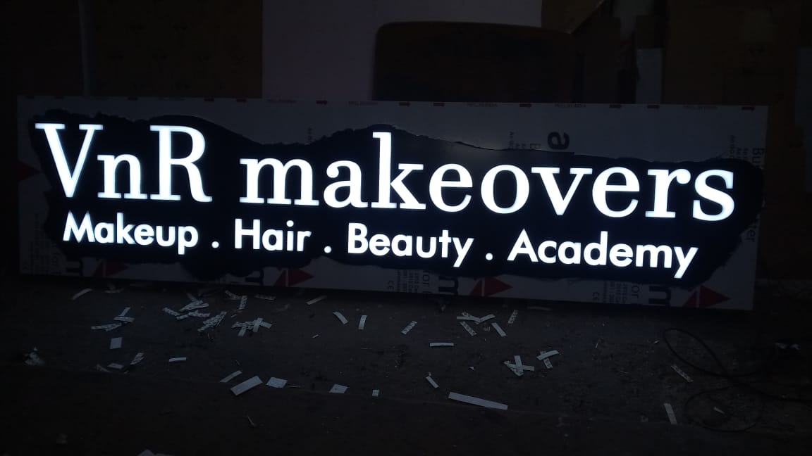 Router cutting ACP as base with Acrylic LED Signage Board, ACP base is cutting for small Letters, LED Used for lighting, price on size and design, Range 800 to 1000/-